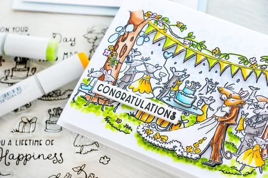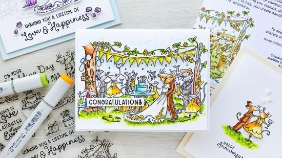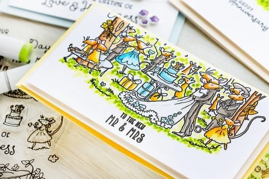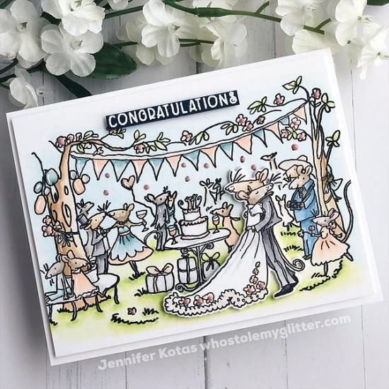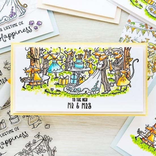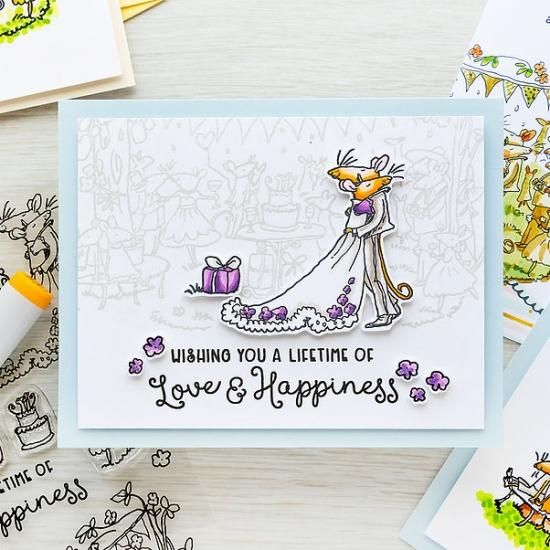 屋外でのネズミの結婚式のシーンが細部まで描かれた、愛らしいクリアフォトポリマースタンプです。