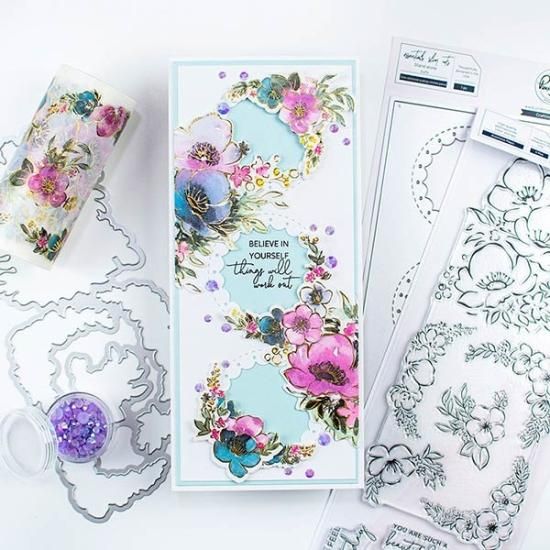 Pinkfresh Studio の【Anemone Magic】4点セット【4×12フォトポリマークリアスタンプPF110821&Anemone Magic レイヤリングステンシルPF122421&Anemone Magic コーディネートダイPF110921&フォイル付きマスキング和紙テープPF122421】です。