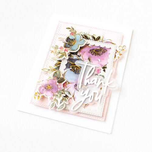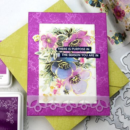 Anemone Magicは、ブルー、グレー、ライラックのクールな色調に、ゴージャスなグリーンがバランスよく配置されています。各花のエレメントには金箔のアウトラインが施され、キラキラと輝きを増しています。それぞれの花のエレメントは、コーディネートされた抜き型で切り取れば、カードやレイアウト、ノートブックの見開きページ、ミニアルバムなどに貼り付けることができますよ。コーディネートされたスタンプセットと組み合わせれば、さらに多様な使い方ができます。
