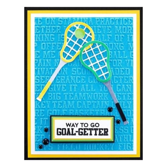 Sports Talk Embossing Folderは、スポーツをテーマにした言葉やフレーズが背景を覆い、テクスチャーと立体感を加えます。
