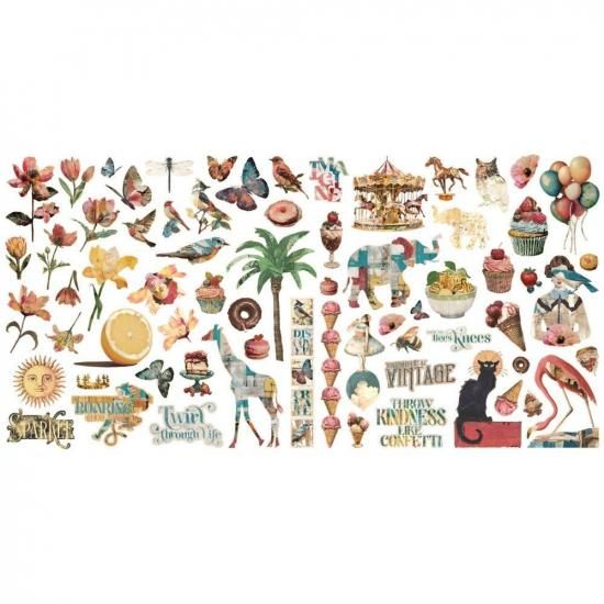 この65点のアソートには、ダイカットデザインのジャーナリングカード、ラベル、タグ、装飾アクセントが含まれており、「ジャーナリング・スルー・タイム」ペーパーコレクションと完璧に調和します。